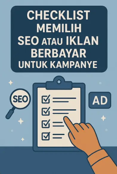 Artikel ini menyajikan checklist memilih SEO atau iklan berbayar sebagai panduan praktis. Dengan memahami langkah-langkah ini, Anda dapat menentukan strategi terbaik sesuai kebutuhan. Jika ingin hasil lebih terarah, layanan jasa SEO dengan panduan memilih strategi tepat bisa menjadi solusi tepat untuk mendukung kampanye digital Anda.