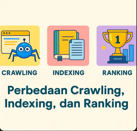 Crawling adalah proses saat Googlebot mengunjungi website untuk menemukan konten baru. Indexing adalah proses penyimpanan konten dalam database Google. Ranking adalah tahap penentuan posisi artikel ketika pengguna melakukan pencarian. Ketiganya saling terkait, namun berbeda fungsi.